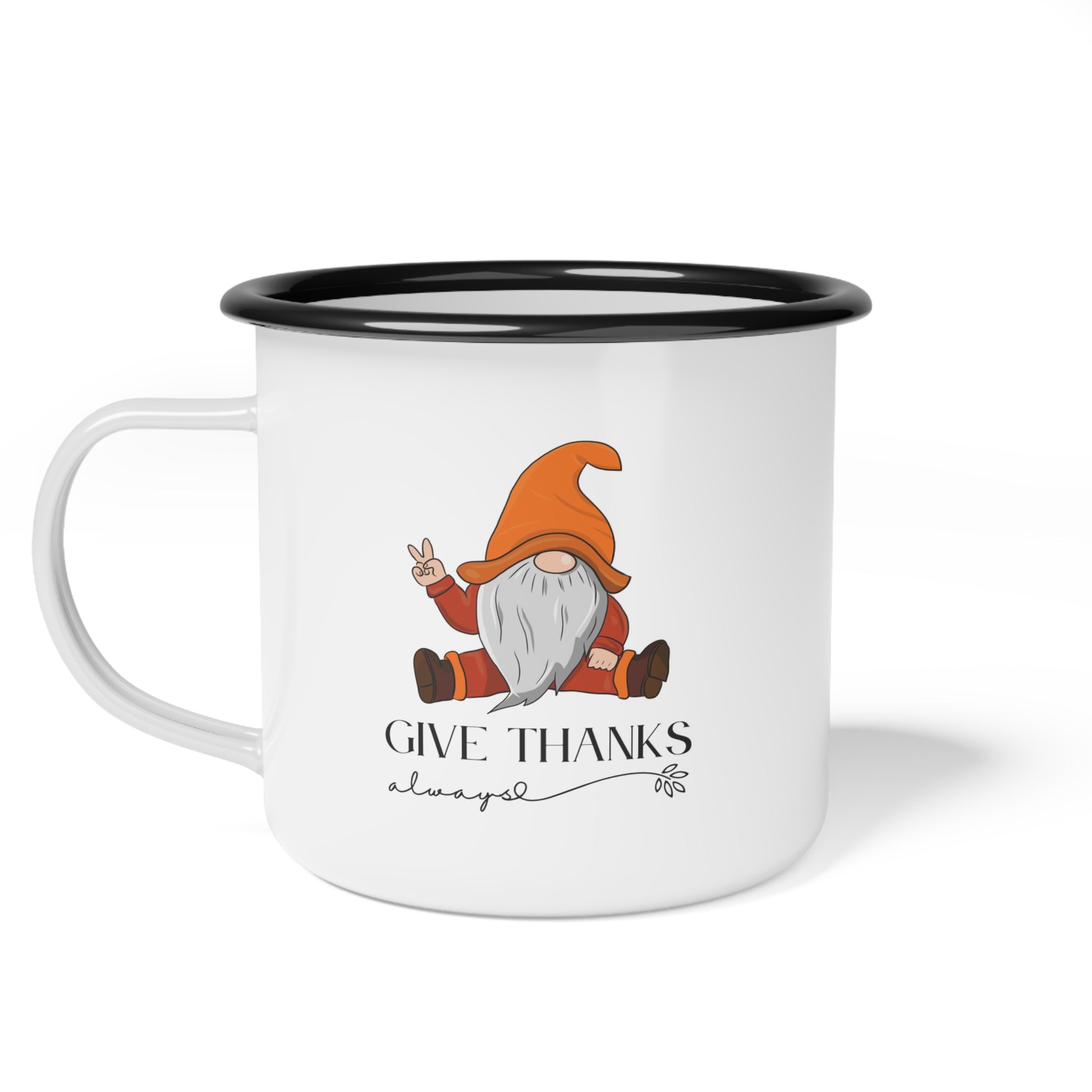 Take this unique cup on your next camping trip, enjoy it during your morning coffee rituals, or gift it to a friend as a charming reminder to "Give Thanks". Its durability ensures it stands up to daily use, whether at home or on the go, making it a versatile choice for anyone who enjoys a practical yet stylish vessel.