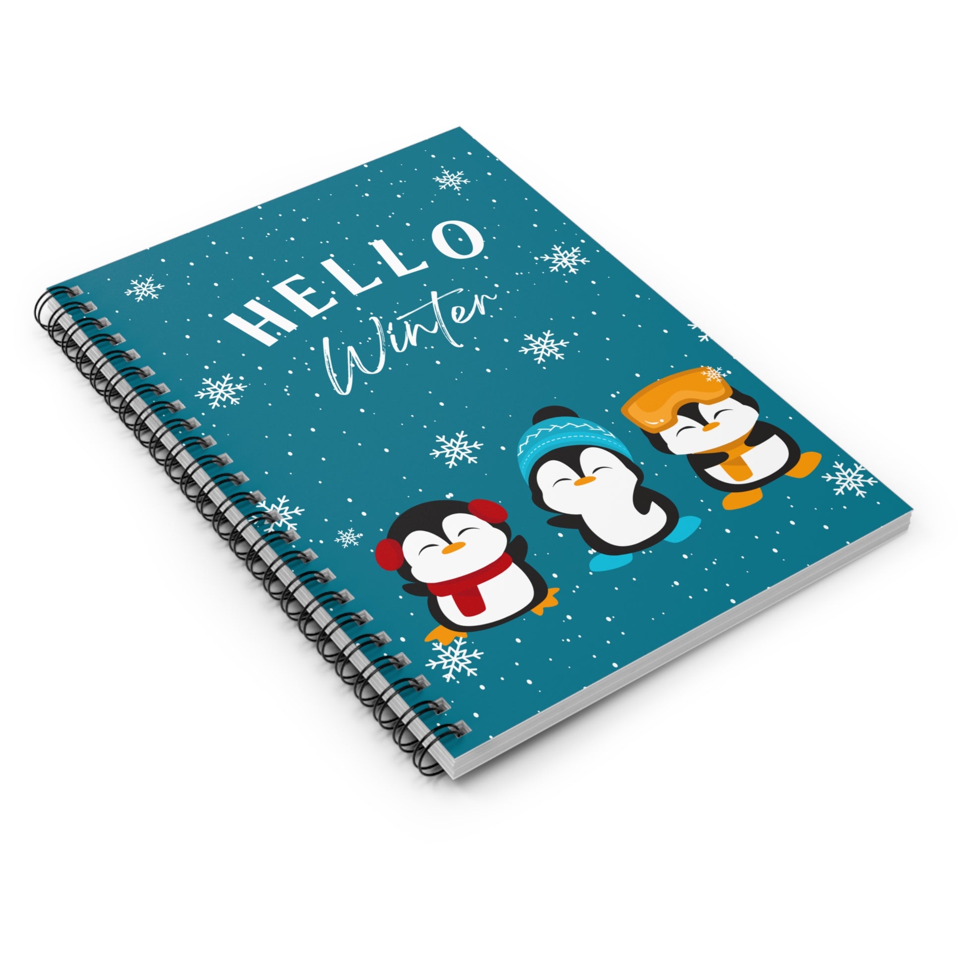 A charming notebook featuring 3 penguins wearing winter accessories with snow falling in the background. Perfect for jotting down notes and thoughts during the winter season. Ideal for animal lovers, winter enthusiasts, and anyone who enjoys cute designs. Relevant for Christmas, winter holidays, and New Year.